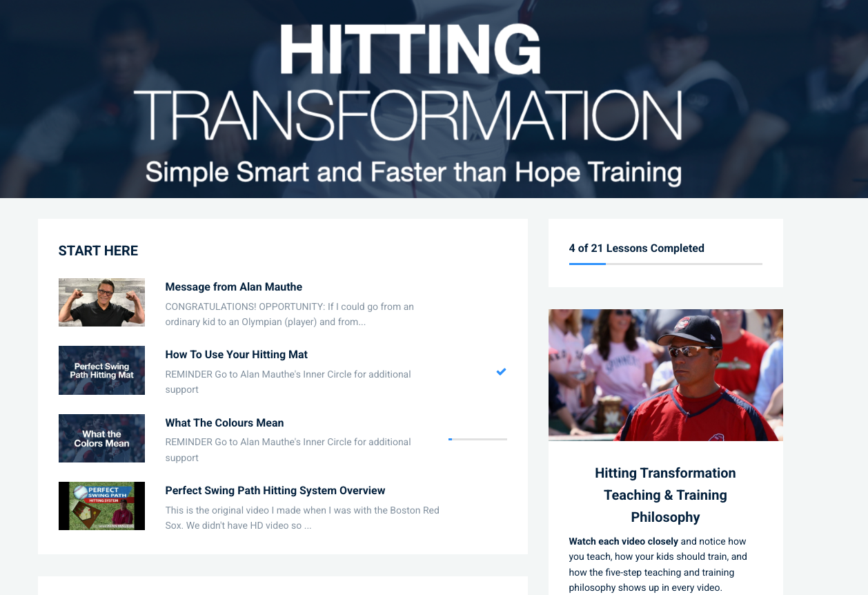Hitting Transformation includes 21 video lessons covering power zones, bat speed, solid contact, and more β plus cheatsheets for every lesson.